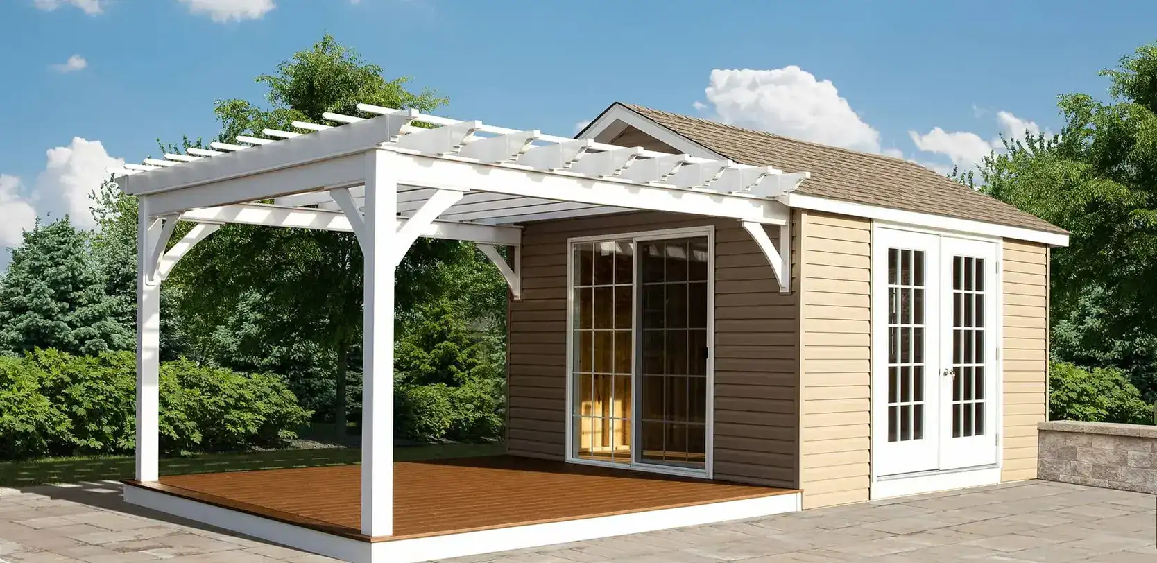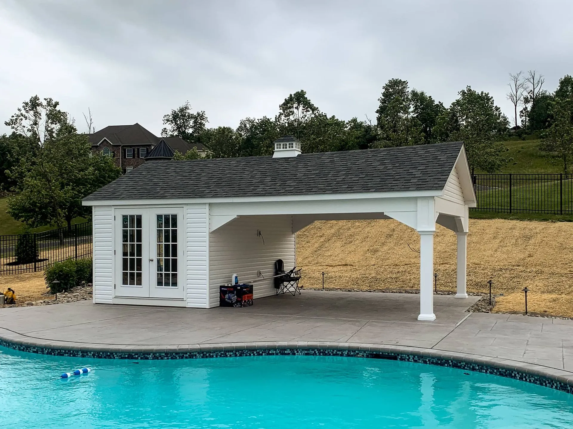 Additionally, we offer a range of add-ons to enhance the comfort and functionality of your outdoor structure. You can choose to include insulation, an electrical package, and custom interior finishes, such as walls and flooring, to create a space that feels like an extension of your home. We now offer modern poolhouse cabanas, gazebos, and sheds in both wood and vinyl, providing you with durable and stylish options that meet both aesthetic and practical needs for any backyard.